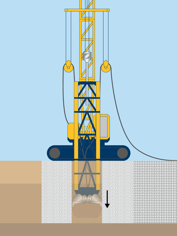 With this technique, vertical panels are excavated under stabilising slurries using mechanical/hydraulic clamshell grabs or hydromill cutters to form a continuous cut-off, retaining and/or structural wall.